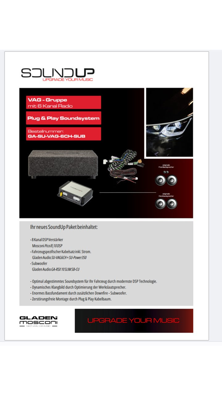 Das GLADEN SoundUp wurde speziell für VAG-Fahrzeuge wie Volkswagen und Audi entwickelt, und ermöglicht eine einfache und relativ schnelle Sound-Nachrüstung bei 6-Kanal Sound-Systemen wie ASS (Audi-Sound-System) mit außergewöhnlicher Klang-Performance.